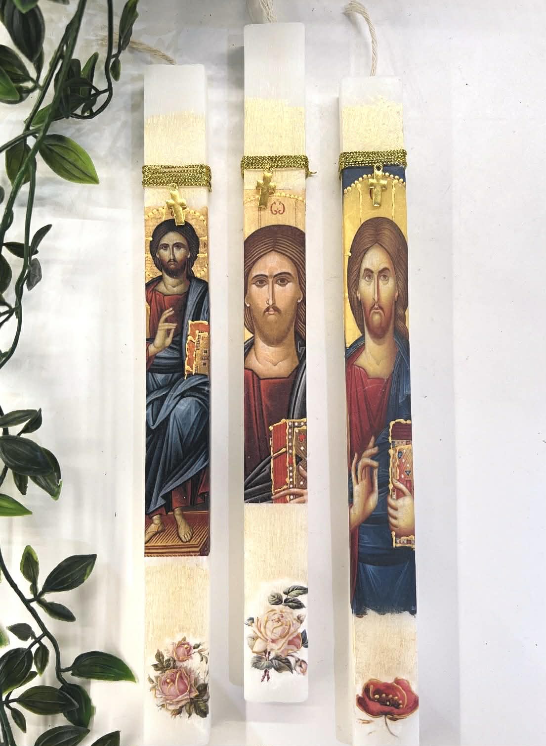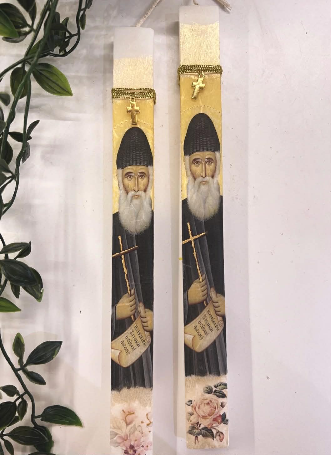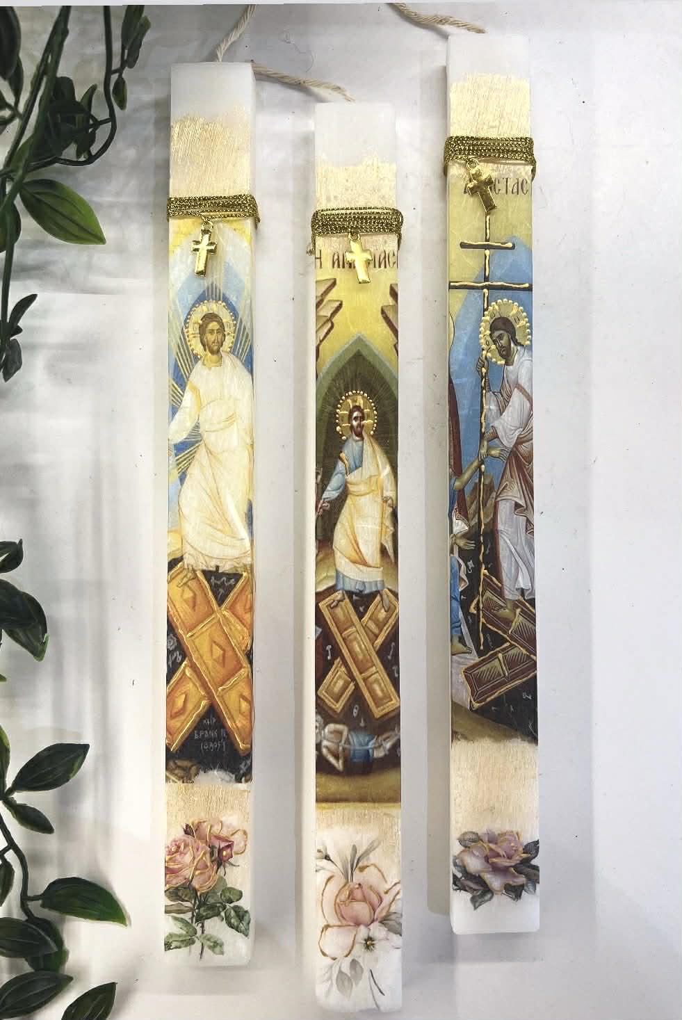 Λαμπάδα παραφίνης με εικόνες σε μορφή ντεκουπάζ και κρεμαστό χρυσό σταυρό για φυλαχτό!